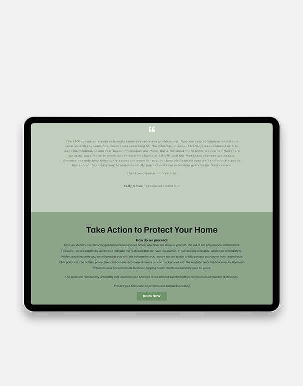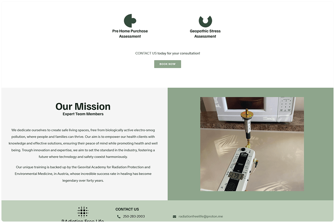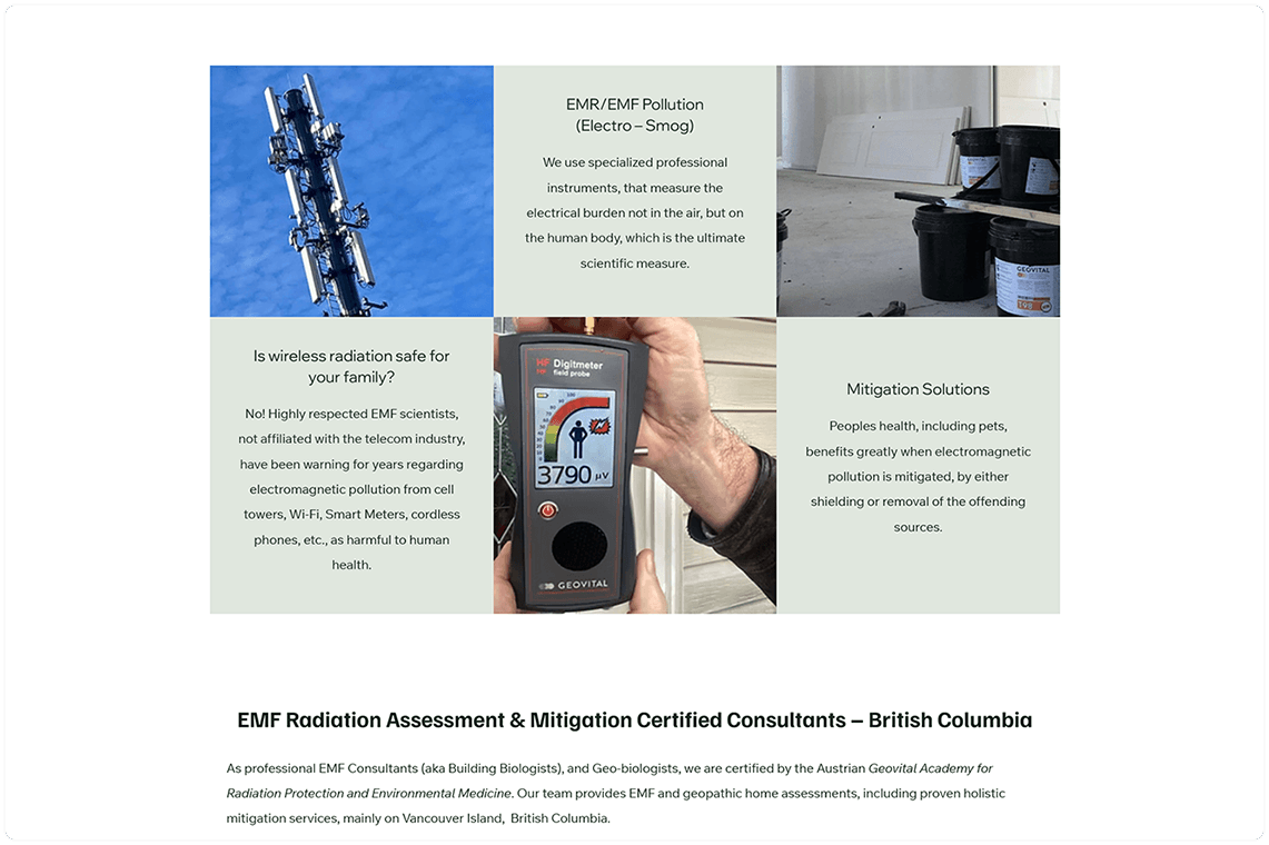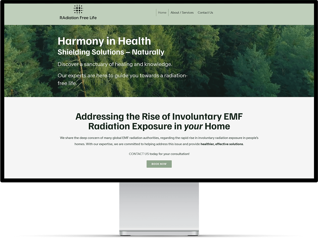 Radiation Free Life is a Vancouver Island-based consultancy dedicated to educating homeowners about EMF and thermal radiation risks—providing professional assessments, mitigation strategies, and certified guidance. Their original site was outdated and struggled to convey their expert services or build trust—so they engaged Webacom for a clean redesign and light SEO foundation to support their mission online.